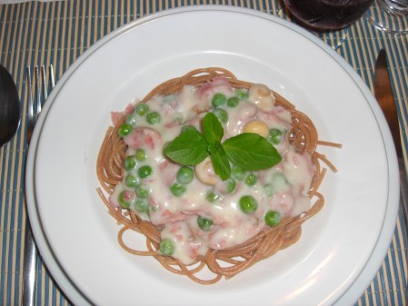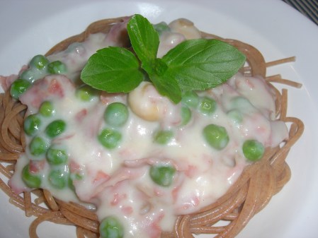 Em um desses restaurantes eu pedia um prato chamado Spaghetti à romanesca que é feito com molho branco, presunto, champignon e ervilha. Até hoje é um prato que me encanta e resolvi colocar a receita para que todos possam apreciar.