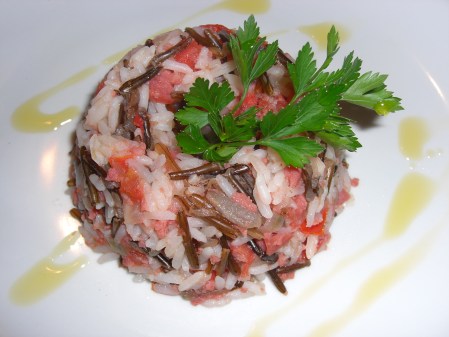 Salada caprese, compota de tomate, sorvete de queijo com gotas de azeite de manjericão.