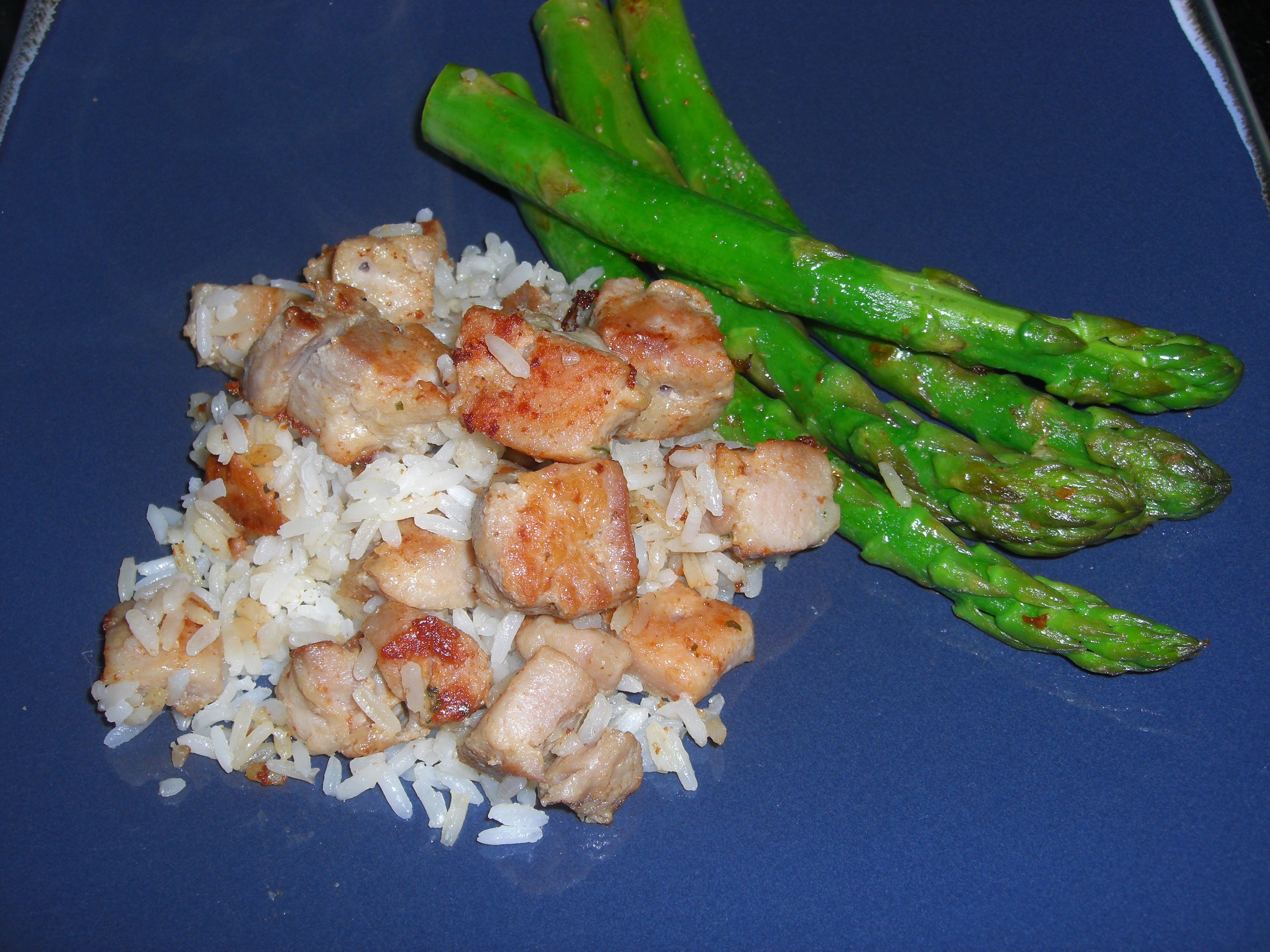 Aspargos passados na manteiga com arroz branco e frango grelhado.