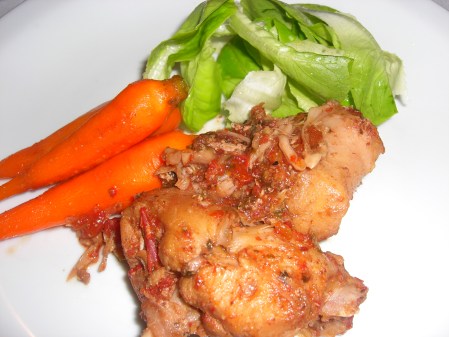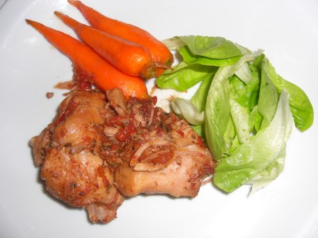 Serve de acompanhamento, neste caso servi com arroz branco e cubos de sobrecoxa desossadas e gralhadas.