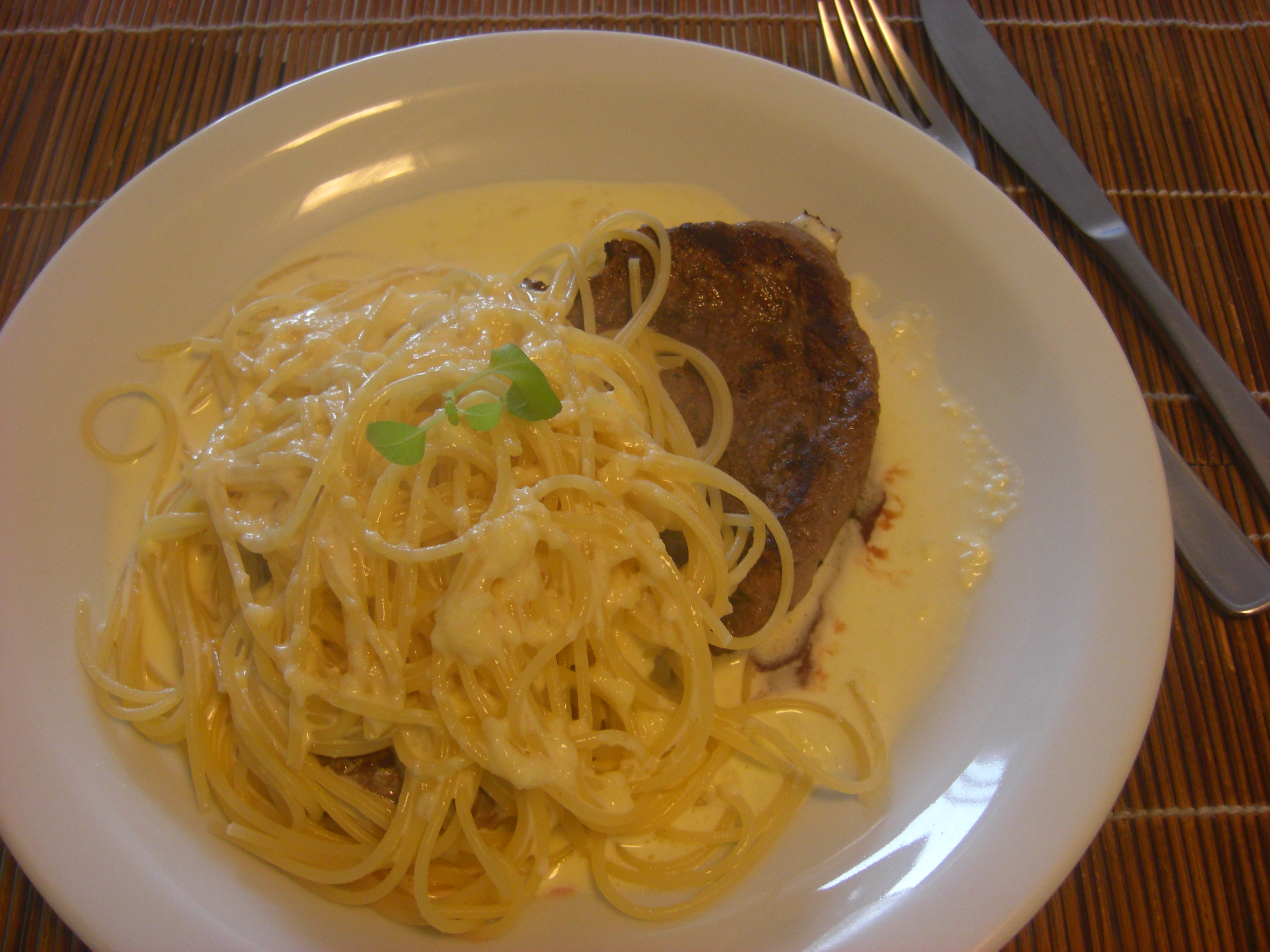 Estou de volta e para comemorar vou mostrar para voces um prato que eu adoro. Um macarrão com molho Alfredo servido com Paillard de filé mignon. E as vezes quando saio e estou sem idéia do que pedir, peço este, que com certeza vai me deixar feliz e muito bem alimentada.