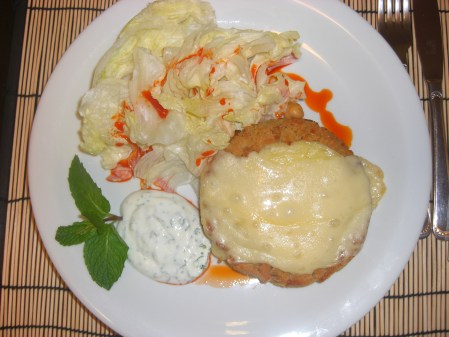 Servi de duas maneiras, como este aí de cima, com uma salada de alface e uma qualhada de hortelã.