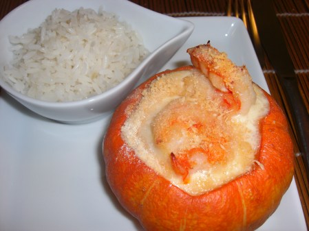 Lembrei que em casa haviam algumas mini morangas, então o prato já estava definido, camarões na moranga.