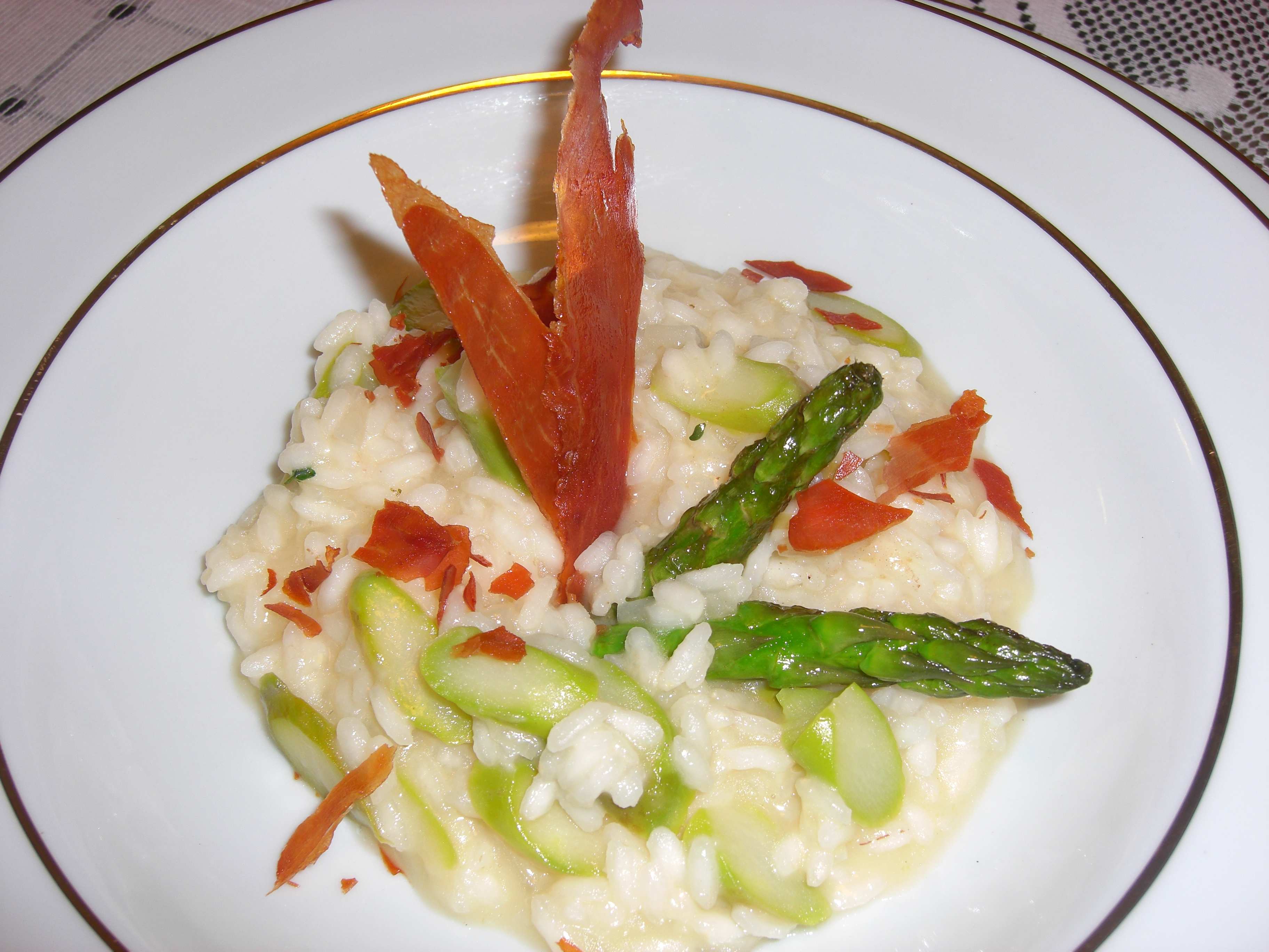 Tenho alguns amigos que amam risotos, e outros que acham uma dificuldade em prepará-los, pensando em todos eles fiz esse risoto de aspargos frescos com queijo Brie e crocante de presunto parma.