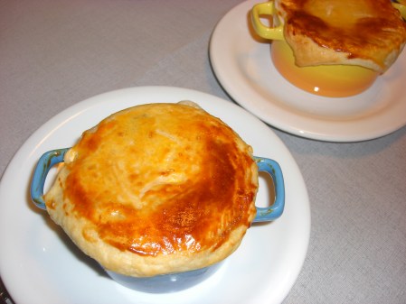 Coloque o recheio em um refratário e cubra com a massa folhada, faça uma abertura na massa para o ar quente sair, assim não rasgará a superfície, pincele com uma gema de ovo e asse em forno quente, aproximadamente 200º, por 20 minutos ou u até estar bem dourada.