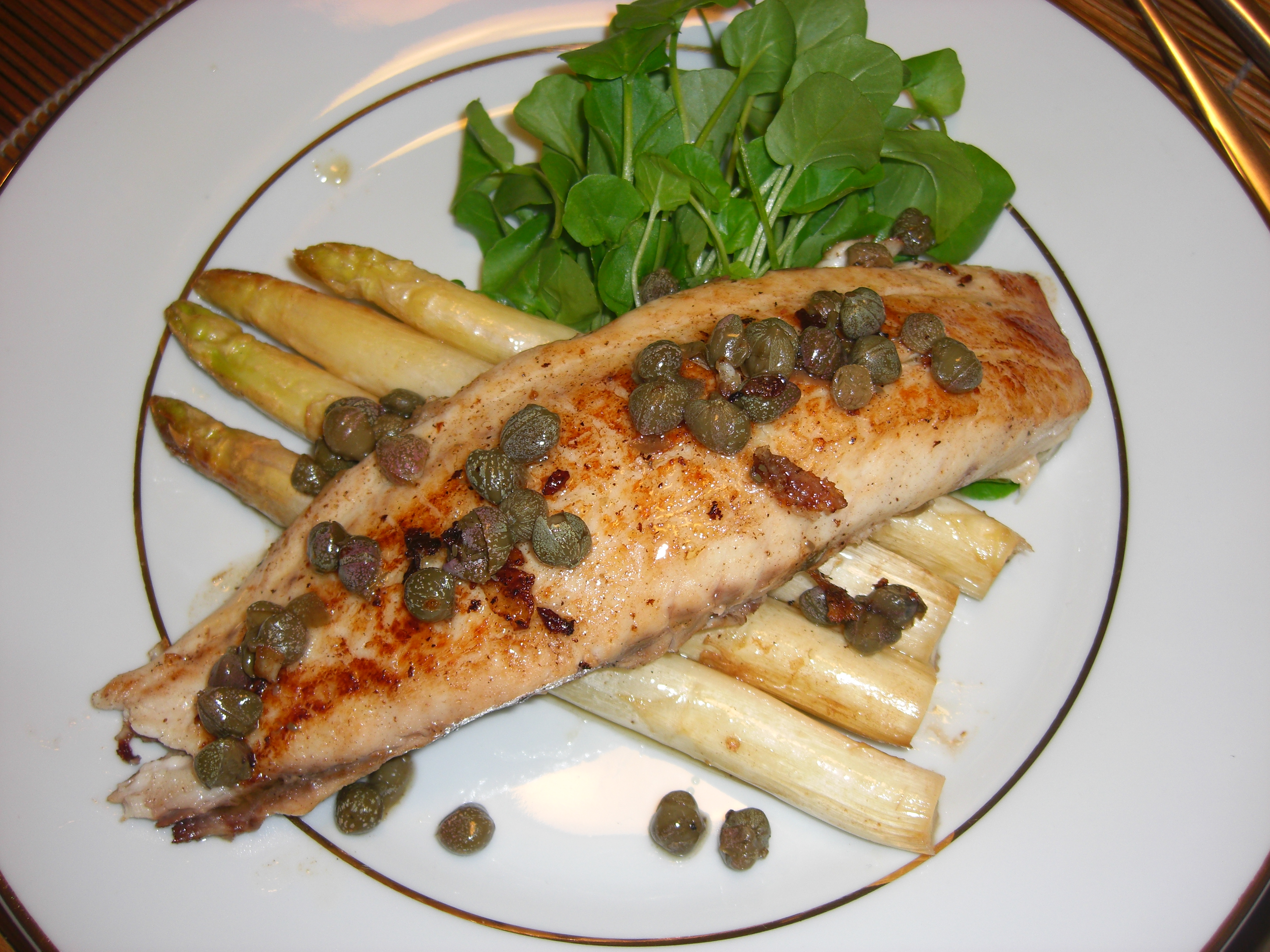 Deixei por apenas alguns minutos enquanto passava os aspargos pela manteiga, o que também não durou mais do que tres minutos, pois aqui em casa gostamos das guarnições sempre “al dente”, feito isso, grelhei o peixe e assim que ficou pronto, fiz um molhinho com alcaparras na manteiga e joguei por cima.