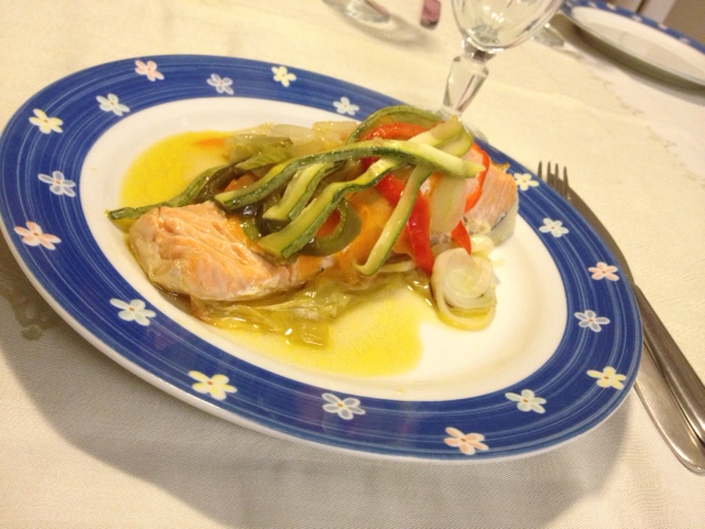 Colocamos em um quadrado de papel alumínio ou papel manteiga uma camada de cebola ou acelga , em seguida  o peixe e por cima os legumes, que poderão  ser de sua preferência, nesse caso ela colocou abobrinha, tomate, acelga e cenoura, tempere tudo com azeite, sal e pimenta do reino, asse por aproximadamente 20 minutos, abra o papelote e sirva.