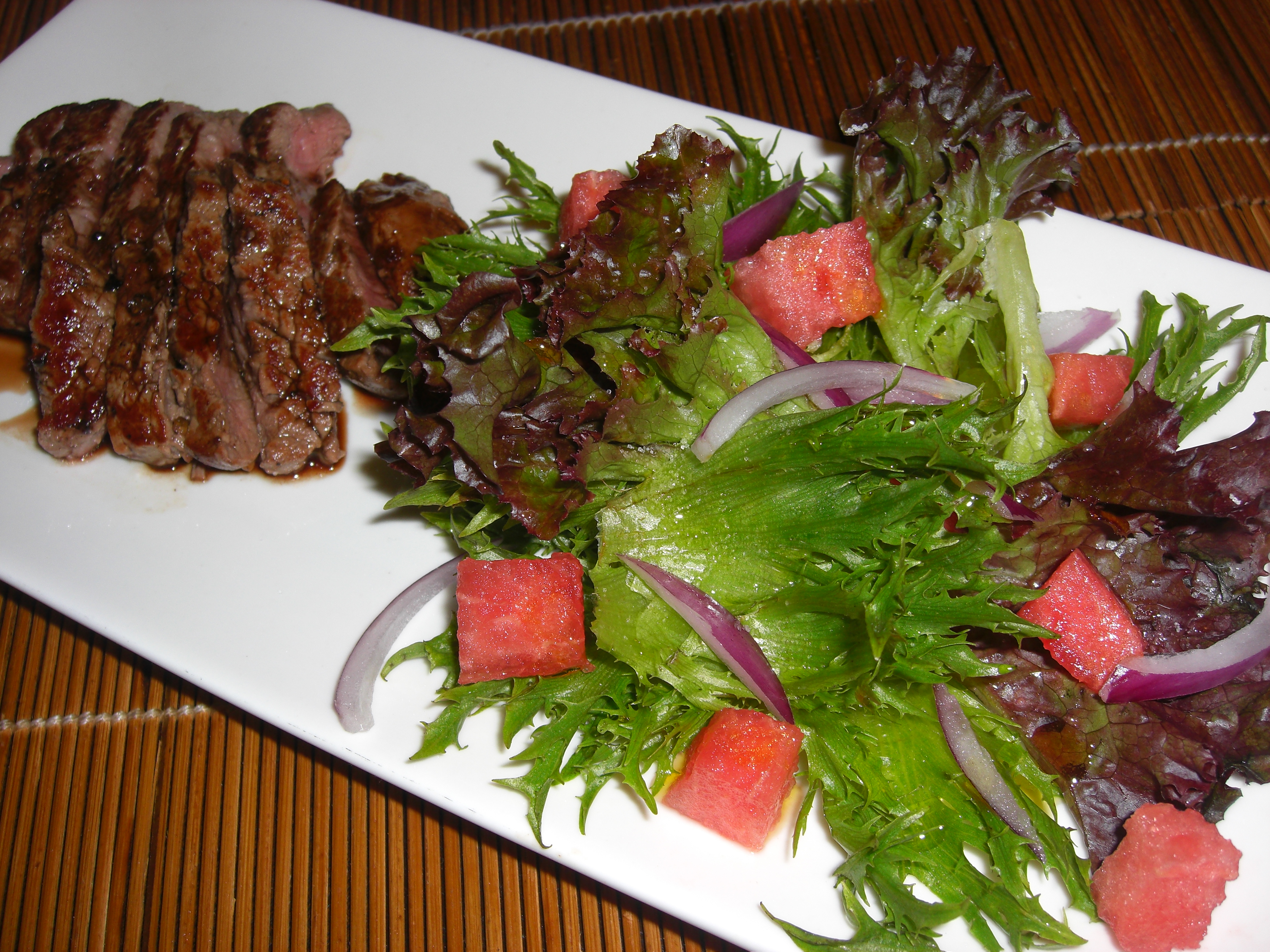 Uma salada de alface frizzê com cebola roxa e melancia, fiz um tempero com um toque oriental e combinou muito bem, servi com algumas lascas de mignon, com uma proteína não precisei de mais nada.