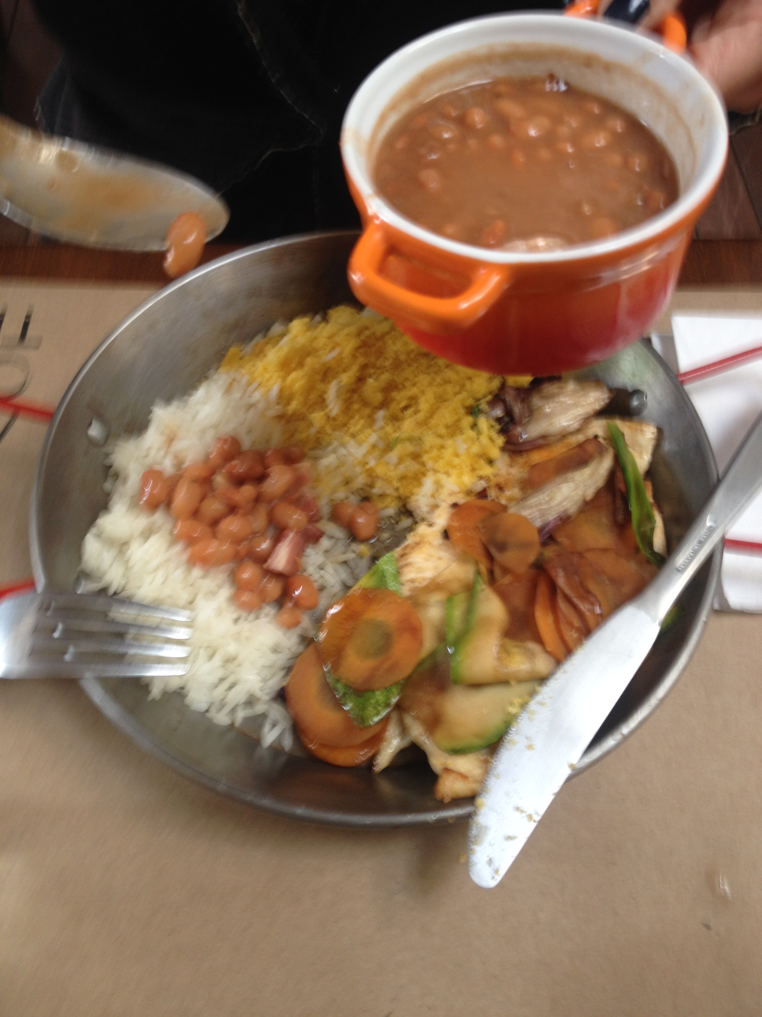 de prato principal eles escolheram uma comidinha bem caseira que foi arroz feijão, filá de frango, farofa de milho e saute de legumes;